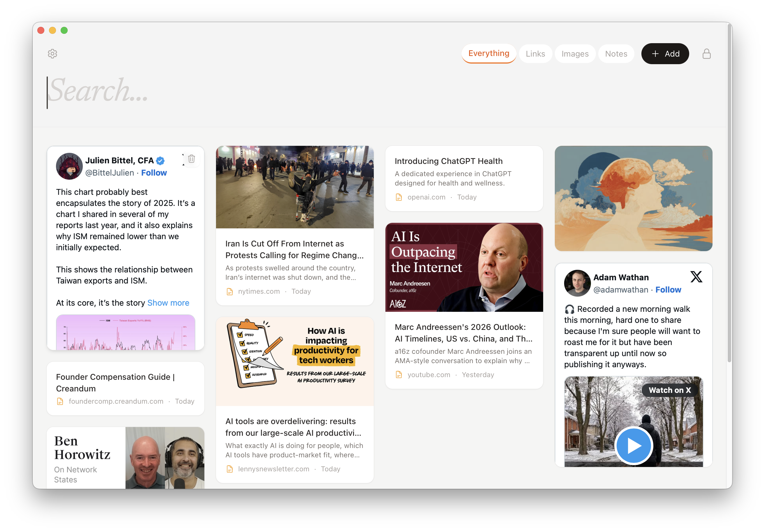 Atlas started as a personal tool inspired by the clarity of mymind.com. I wanted the same calm experience, but local and fully under my control.